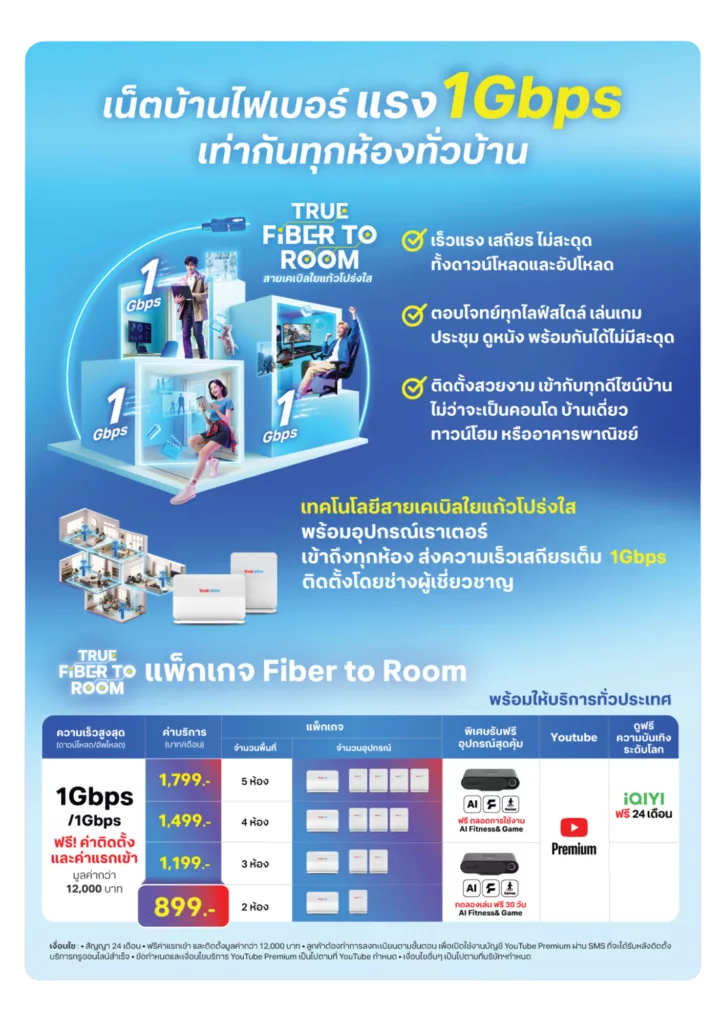 ใหม่ True Fiber to room ให้ทุกห้องในบ้านคุณ เล่นเน็ตแรง 1000/1000 Mbps ทุกห้อง พร้อมด้วยกล่อง True ID box และ Content สาระ และความบันเทิง ครบครัน ด้วย youtube premium และ Application Ai Fitness, Game และ Karaoke